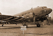 This C-47 is parked on Pierced Steel Plank (PSP) «hardstanding» at what the original Signal Corps caption indicates is «an advanced fighter base near the front line» in Normandy.