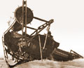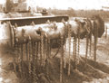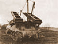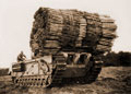 Sherman AVRE mounted with a folding Small Box Girder bridge Log Carpet. This comprised of a carpet of up to 100 logs, each 14 ft long, with an average diameter of 6 - 8 in, laid side by side and joined with wire rope passed through each log. The carpet was carried on a steel frame, mounted above the AVRE turret, and held in place with wire lashings at the forward end. After positioning the AVRE, small charges were fired to cut these cables and the first section of the carpet fell towards the ground. The weight of this pulled further logs off the frame in front of the AVRE and when the first few had reached ground level, the AVRE drove slowly forward over the logs until the entire length of the carpet had been laid. The length of carpet was up to about 80 ft.