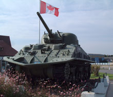 This Sherman, belonging to the 1st Canadian Hussars, is one of the five (out of nineteen) that sank on the run in. It was recovered in 1971. Note the lip extending around the entire hull to which the canvas dam was attached. The DD's making it ashore provided vital fire support for Company A of the Regina Rifles, which encountered heavy fire both from German resistance nests in the harbor area and from artillery positioned further inland.