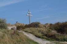 The tank is a Churchill AVRE, which laid buried in the sand until its recovery in 1976. Keep driving along the street, then park your car close to the Lorraine Cross, erected there to commemorate the landing spot of Gen. de Gaulle, who was on board La Combattante. Walk down the beach, through the breach, along side Cosy's Bunker, on the west side of the Seulles River which contained a 75 mm field gun and a very large anti-tank gun. A story of unimaginable courage took place near this pillbox. It concerned Corporal «Bull» Klos. Royal Winnipeg Rifles history: «Rushing the enemy, «B» Company encountered heavy enemy fire. Corporal Klos, badly shot in the stomach and legs while leaving the assault boat, made his way forward to an enemy machine-gun nest. He managed to kill two Nazis before he was mortally felled. His hands still gripped about the throat of his victim produced a chilling sight!».