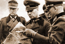 General Rommel (center) on his inspection tour of the beach defences in the 84th Army Corps Zone. General Marcks is seen standing to the left.