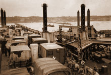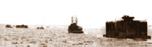 Two causeways were made of Rhino ferries Pontoons, with one of them extending beyond the Gooseberry. Then the troops could land «dry» and small craft could moor and unload alongside them.