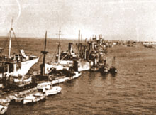 Gooseberry 2 provided the first shelter for craft discharging in Mulberry A. In order to allow rapid access to the beach for light craft, the Americans decided that two gaps should be left between the ships, in effect making three breakwaters. Royal Navy Officers had warned that the sea would pour through the gaps in bad weather, which was proved correct when a storm blew up on June 18. Cdr. C. R. Dennen, USNR, directed the scuttling operation and the great bulk of Centurion provided a cornerstone to the breakwater. The next three ships, «James Iredell», «Baialoide» and «Galveston», were sent to the bottom under sporadic gunfire from inland; however, the Gooseberry was completed by June 10. Here too, a pontoon causeway was erected by the Seabees opposite the Saint-Laurent exit and was in use by that date. At Mulberry A the Bombardons were laid by Cdr. L.D. Ard, USNR.
