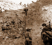 The Rangers came in forty minutes late in ten LCA's, trailed by four DUKW's and two supply boats. They lost one of each boat type on the run in. The LCA's were equipped with rocket-propelled grappling hooks which were fired as the boats grounded under the cliff. Despite small-arms fire, improvised mines, and grenades lobbed from above, the Rangers used their rope and aluminum ladders to scale the cliff within five minutes of landing. Ironically, they found the casemates empty of guns, which days before had been displaced further inland. Later that morning, a patrol found the 155s unguarded and spiked them. Colonel Rudder then set up a defensive perimeter and waited for reinforcements. «Located Pointe du Hoc», he managed to signal V Corps that afternoon, «mission accomplished need ammunition and reinforcement many casualties». Those reinforcements were to have come from Rangers of the 2d and 5th battalions waiting offshore.