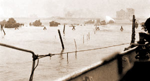 Disaster was narrowly avoided when the DD tanks ran into the path of some of the LCTs carrying the demolition teams. In the event, quick thinking and fast manoeuvring enabled 21 out of 25 DD tanks to reach shore safely, just ahead of the infantry, who began to disembark at about 7.30 am. On the right, the 1st South Lancs made rapid initial progress. Within two hours they had cleared three exits from Queen White, and pushed a mile and a half inland to take the village of Hermanville. Just beyond this lay the important landmark of Périers Ridge, but this was strongly held by troops of 21st Panzer Division, with support from 88mm guns, and the British advance stalled on the outskirts of Hermanville, where the South Lancs dug in. Meanwhile, on Queen Red, the East Yorks met determined resistance in clearing enemy strong points, and before this was eventually completed further problems had begun to present themselves. Owing to the prevailing wind, the tide came in both much faster and further than had been expected. As a result the engineers were unable to clear all of the beach obstacles, and follow-up waves of landing craft became severely congested as they tried to find a safe path to shore. To add to British problems, German artillery fire, zeroing in on the barrage balloons flying above the landing zone, was proving unpleasantly accurate.