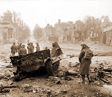The remains of a universal carrier blown up by a mine in Tilly-sur-Seulles, 19 June 1944. Note the massive destruction at the back.