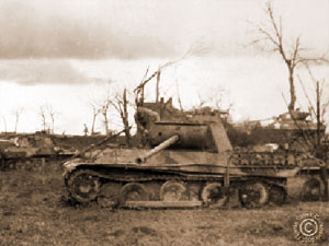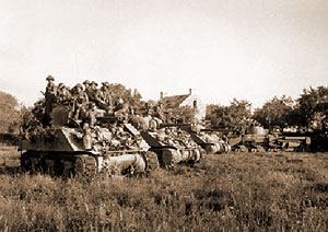 By the middle of the morning the South Lancashire had taken Hermanville, the East Yorkshire were clearing the defences south of Ouistreham and the Suffolks, having taken Colleville, were attacking two strong-points a mile or so to the south, known to the Allies as «Morris» and «Hillman». The former, containing four field guns, was taken easily since the area had suffered heavily bombing and shelling, its garrison of 67 came out with their hands up as soon as the attack opened. But Hillman was another story as you now know. The 185th Brigade Group had landed nearly up to time and the infantry was assembled in woods half a mile inland by about eleven o'clock. The brigade was to be the spearhead of the division's attack inland; it was to advance with all speed and if possible capture Caen and the ground immediately south of it that day. The advance was to be led by a mobile column of the 2nd King's Shropshire Light Infantry, riding on tanks of the Staffordshire Yeomanry and supported by the 7th Field Regiment, R.A.; but at noon the infantry's heavy weapons and vehicles were still not clear of the congestion on the shore and the tanks that had succeeded in getting through were being held up by a minefield. Leaving these to overtake them as quickly as possible, the infantry started marching south «en route» to Caen at about 0.30 pm and by 2.00 pm they had climbed the Périers rise. The leading Yeomanry had overtaken them but enemy guns in woods to their right knocked out five tanks of the Staffordshire and four flails of the Westminster Dragoons and a company of the infantry were sent off to join the Yeomanry in taking the position. The rest of the column moved on towards Beuville and Biéville while a squadron of the Staffordshire occupied a commanding position at Point 61.