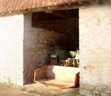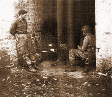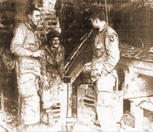 Picture shows Bob Sink standing outside the main door, of his second command post upon arriving in Normandy. He probably landed in between Vierville and Le Grand Chemin south of Foucarville where Major Strayer, Captains Nixon, Hester and Gross also landed with another 700 men.