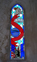 This stained glass window was dedicated in 2004 as a memorial to Ken Moore and Bob Wright and to the town of Angoville-au-Plain. This window, and a few others were shipped for free by DHL, which apparently was the only shipper who would handle this project.